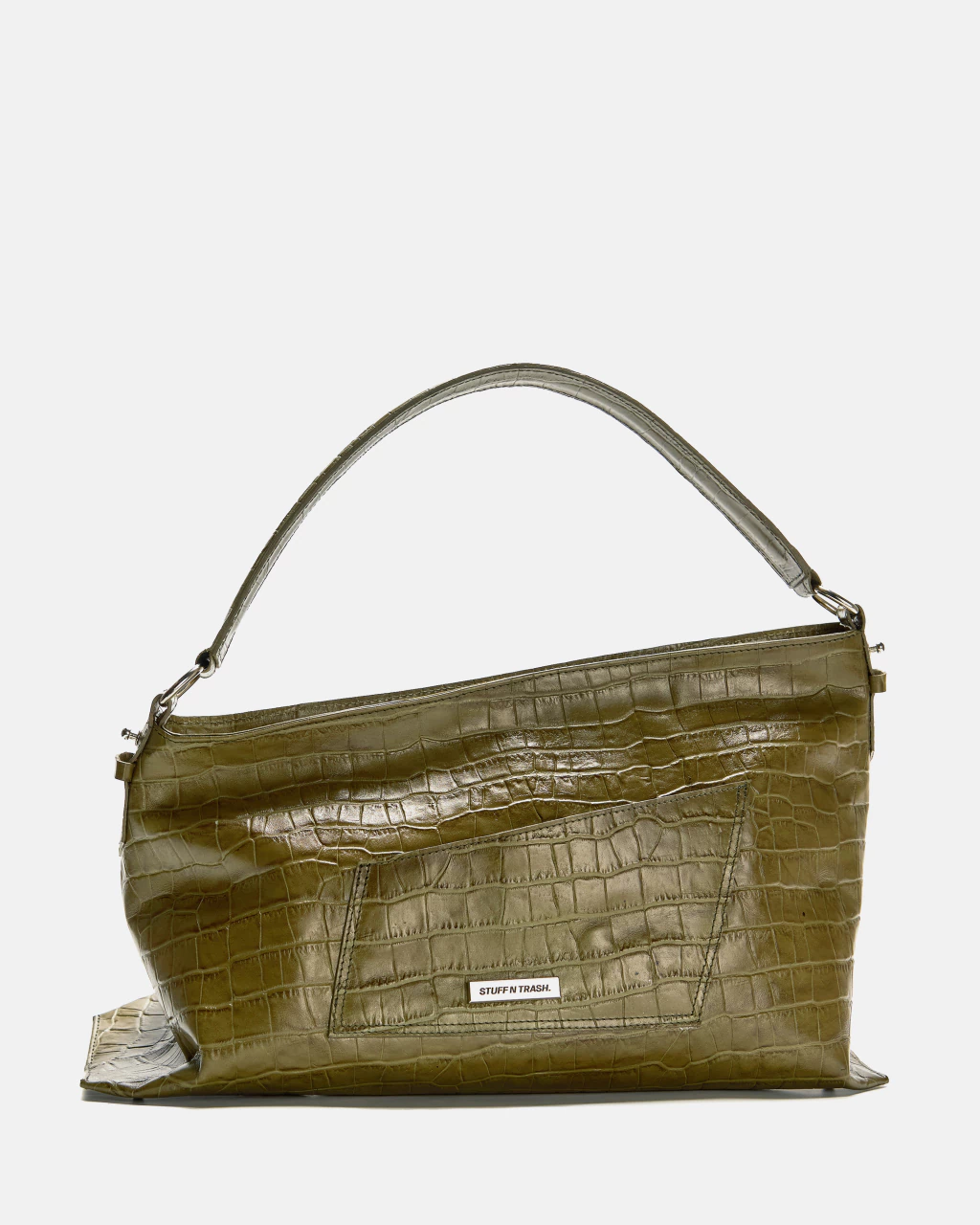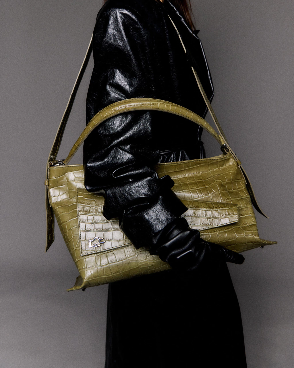 Angle Maxi Bag en cuero vacuno verde seco con textura cocodrilo. El Acceso es mediante cierre metálico y presenta un bolsillo con solapa, cierre en el frente y un bolsillo plaqué en el trasero. Cuenta con una manija corta fija para llevar al hombro y una correa extraible que se regula mediante gemelos y pasadores de cuero. El interior esta forrado en 100%algodón y contiene un bolsillo con cierre.