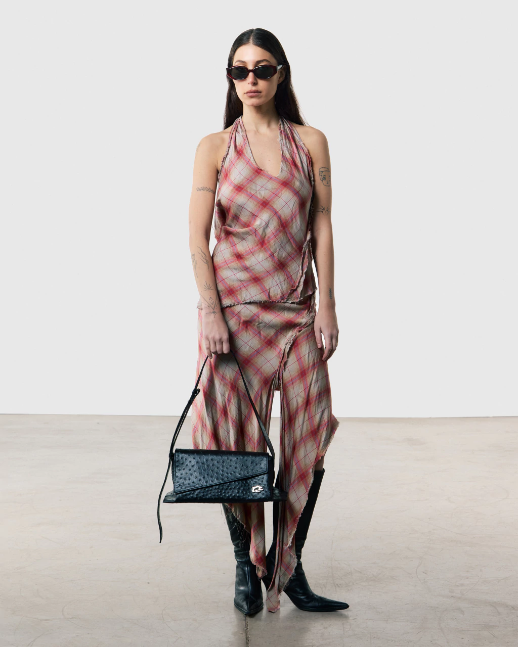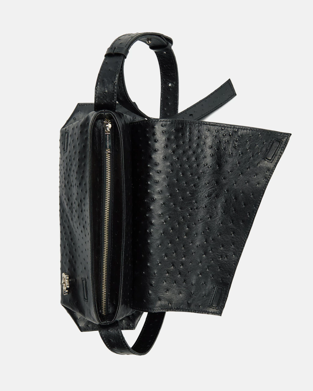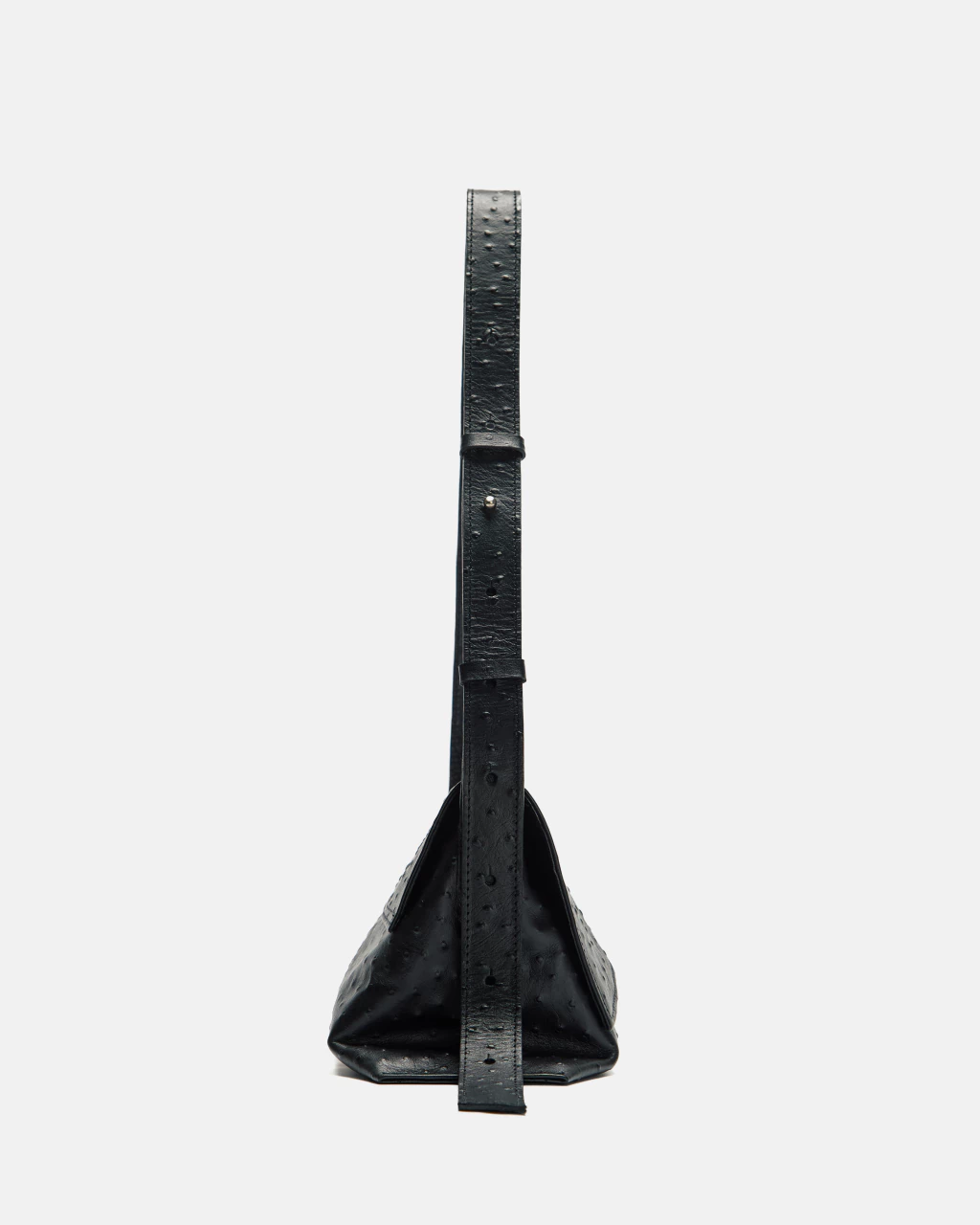 Angle Mid Bag en cuero vacuno negro grabado con textura avestruz. La solapa cuenta con dos imanes ocultos y su acceso es mediante cierre metálico. El interior está forrado en 100% algodón y cuenta con un bolsillo plaqué. La correa es regulable mediante gemelo y pasador de cuero.