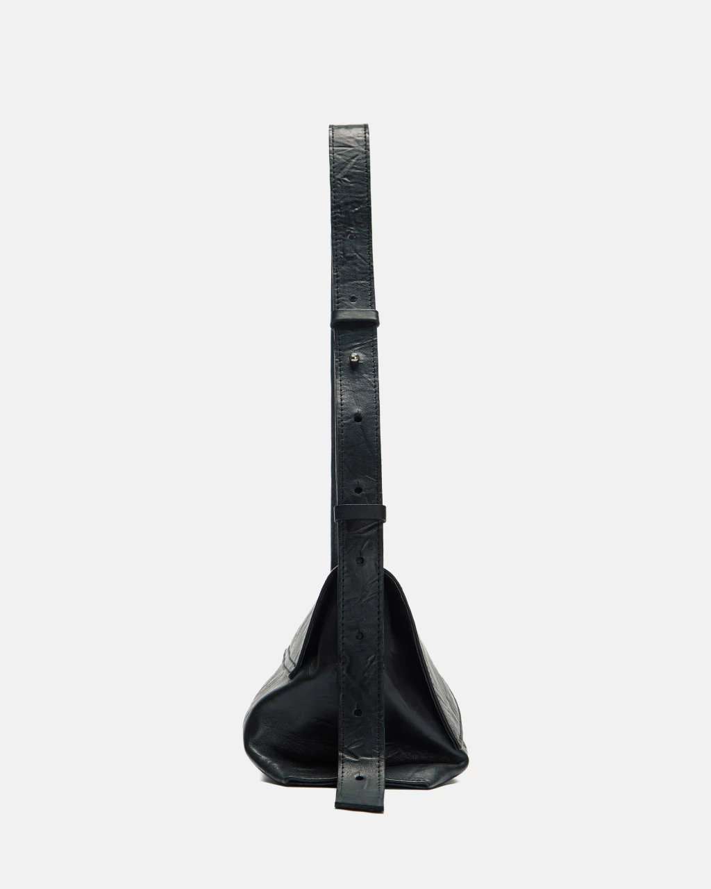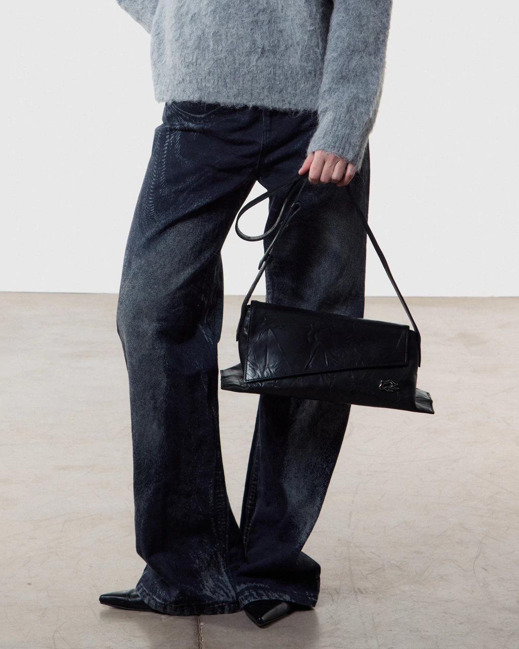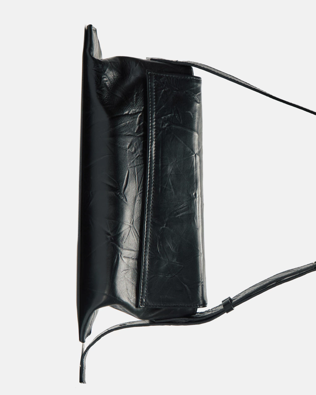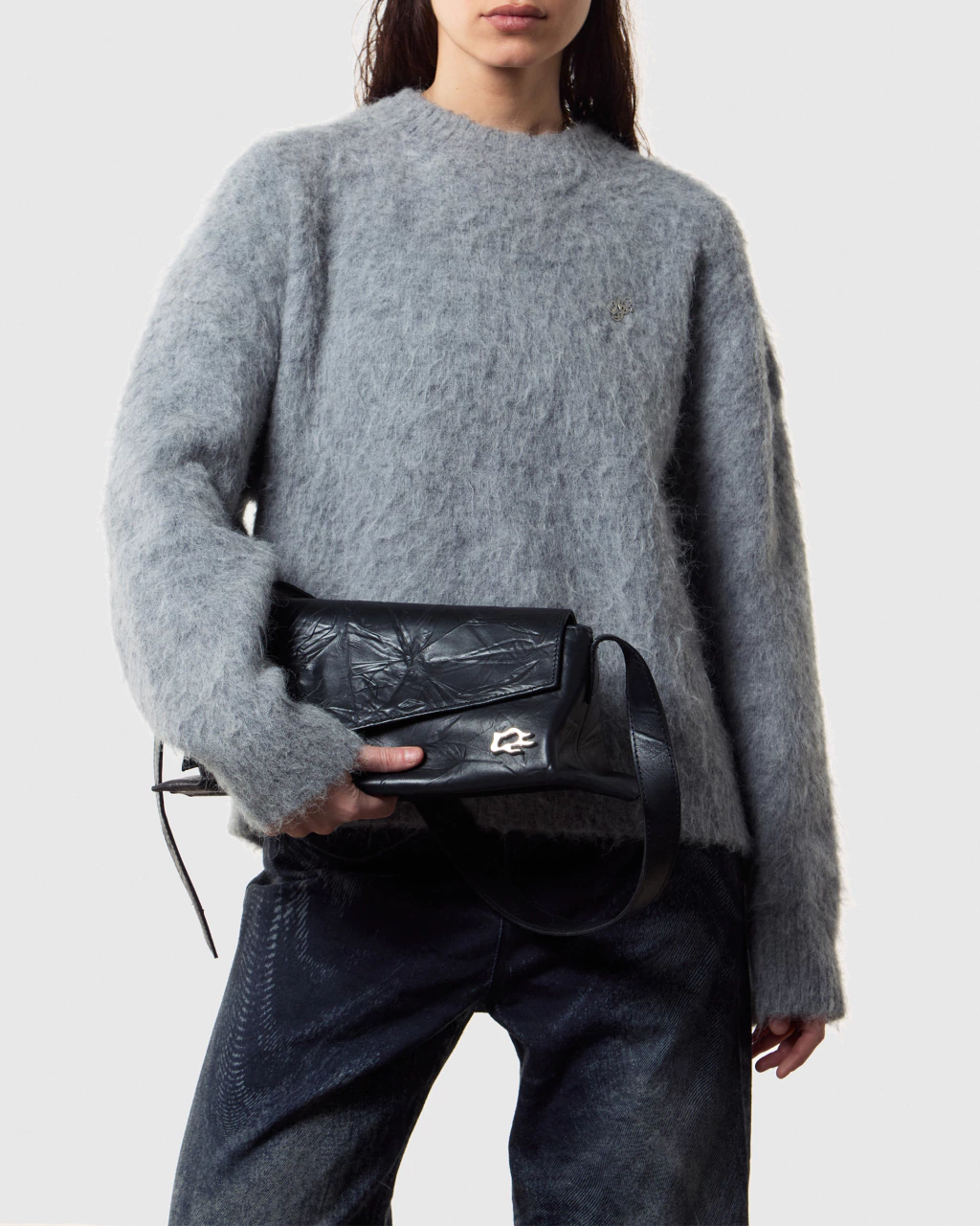 Angle Mid Bag en cuero vacuno negro grafito grabado con textura. La solapa cuenta con dos imanes ocultos y su acceso es mediante cierre metálico. El interior está forrado en 100% algodón y cuenta con un bolsillo plaqué. La correa es regulable mediante gemelo y pasador de cuero.