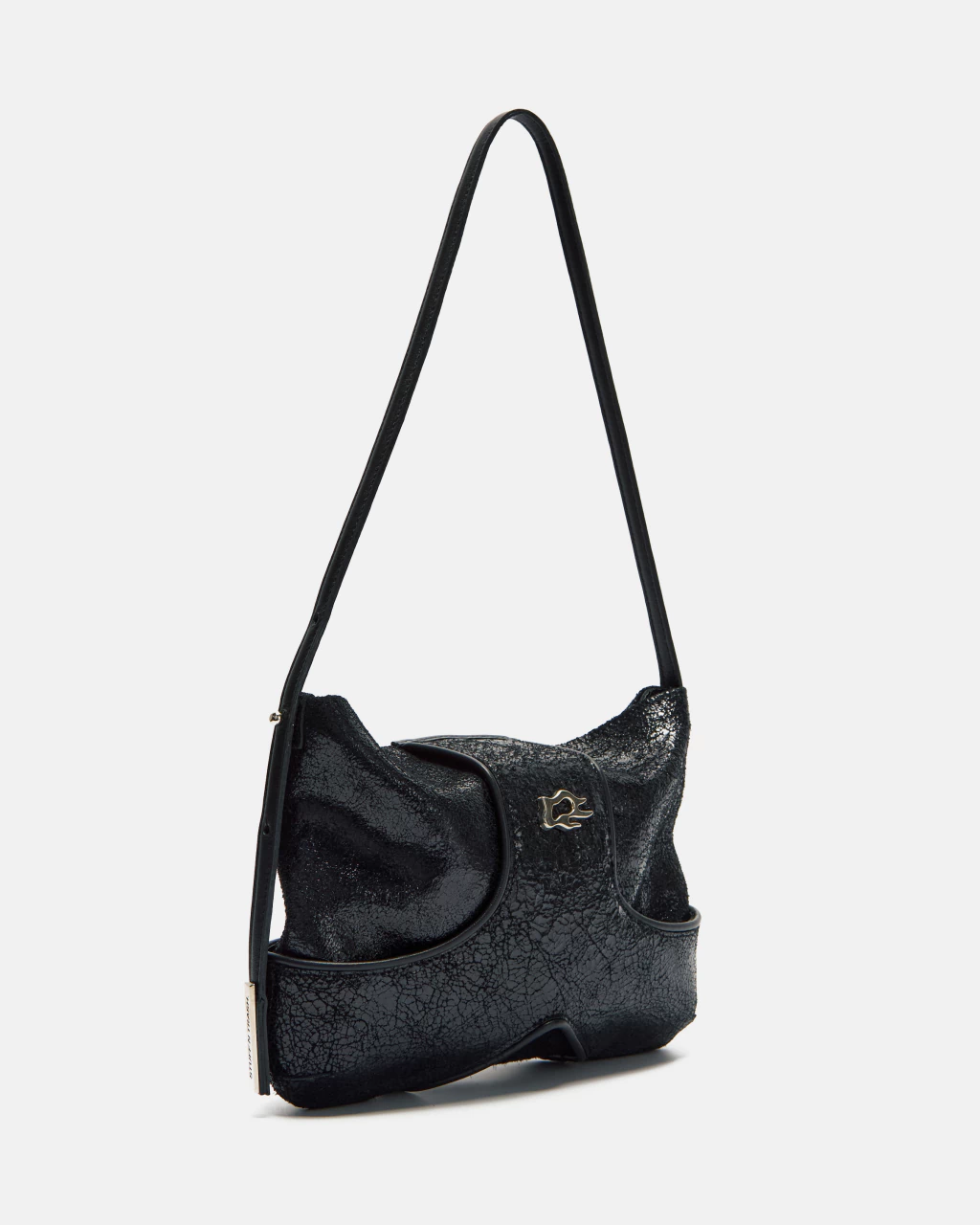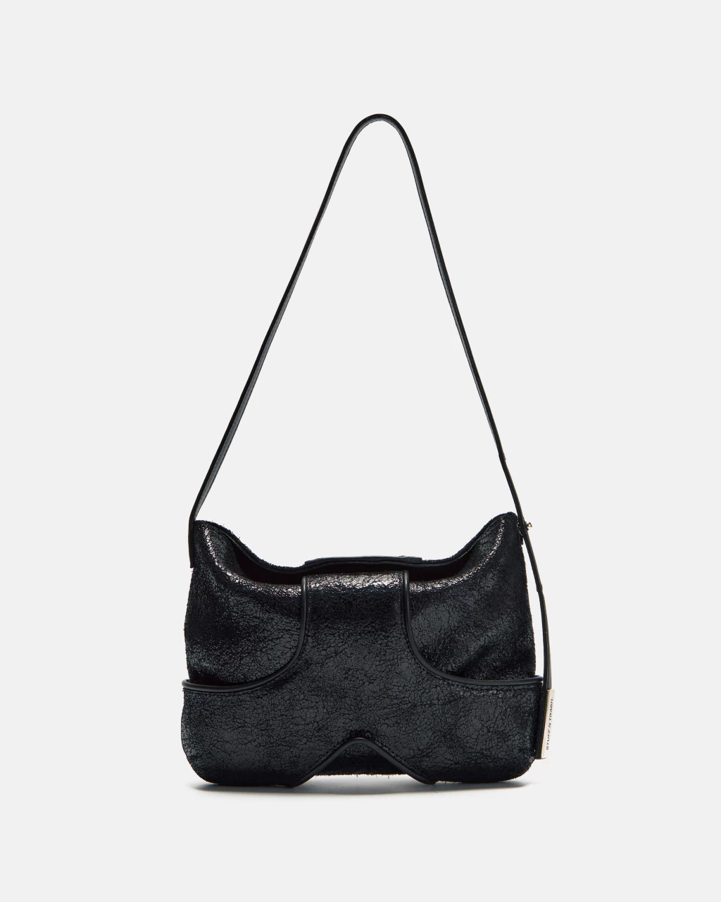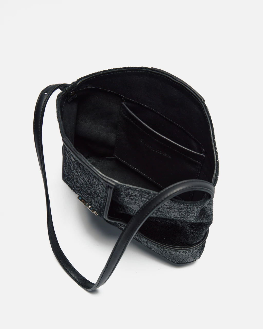 Axis Bag en cuero vacuno negro craquelado. El acceso es mediante imán oculto y cuenta con bolsillo de cuero en el interior. La correa se puede regular mediante un gemelo en el lateral de 62 a 72cm.