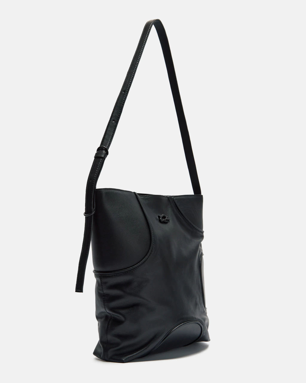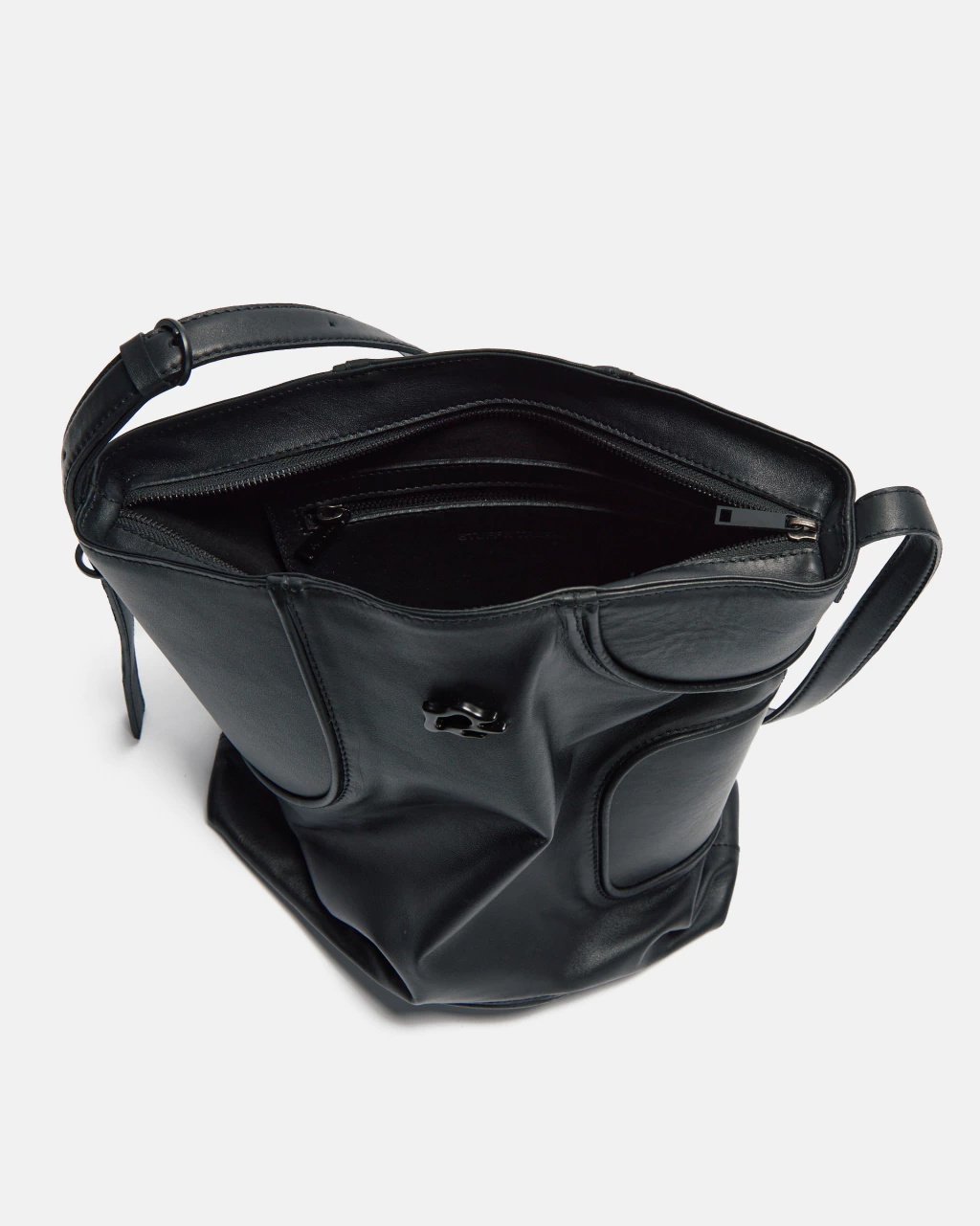 Axis Tote Bag en cuero vacuno negro con correa. Cartera de forma rectangular con recortes y herrajes color negro. La correa se regula mediante hebilla en el lateral y medialuna metálica. El acceso es mediante cierre metálico y el interior esta forrado en 100% algodón el cual cuenta con un bolsillo con cierre.
