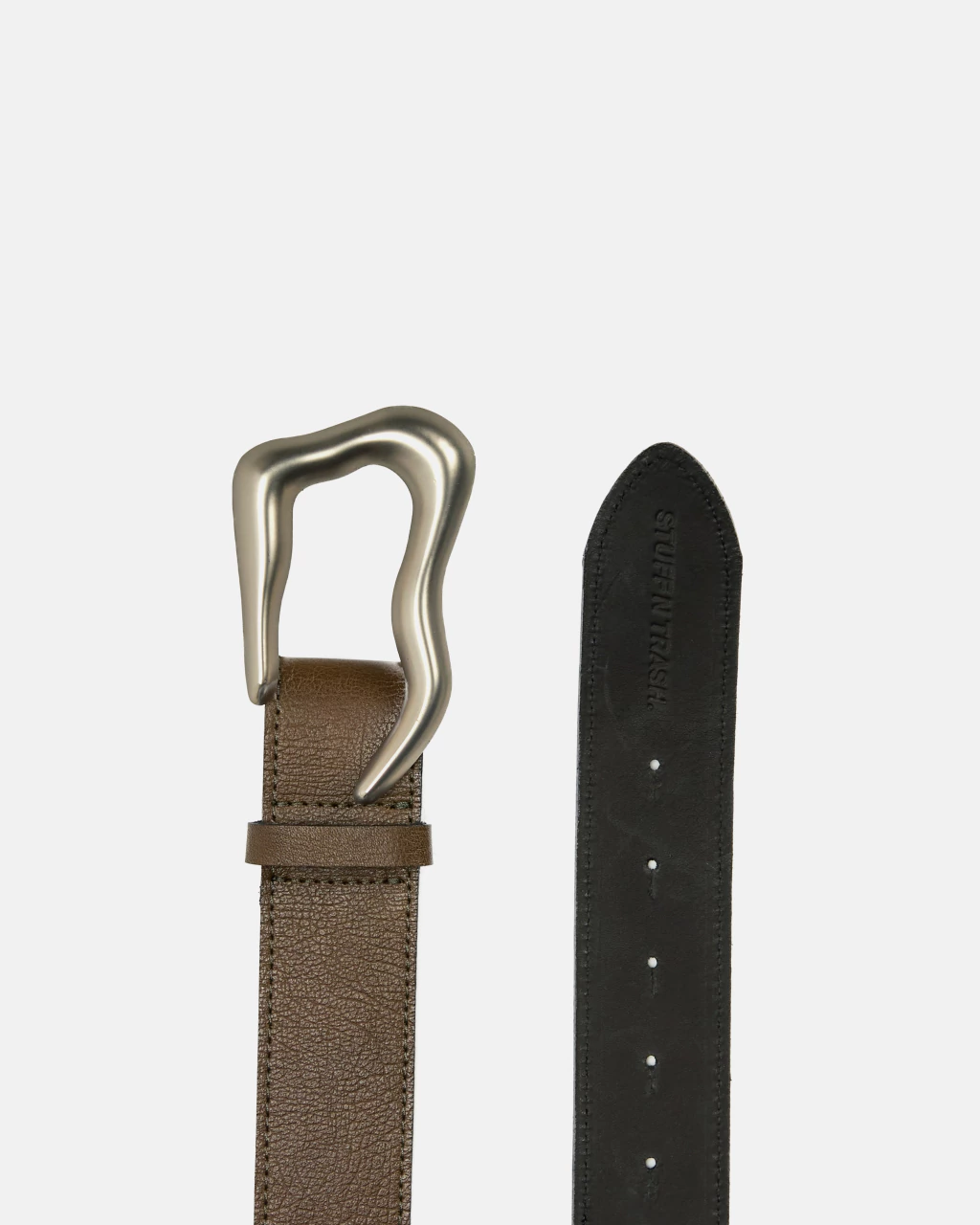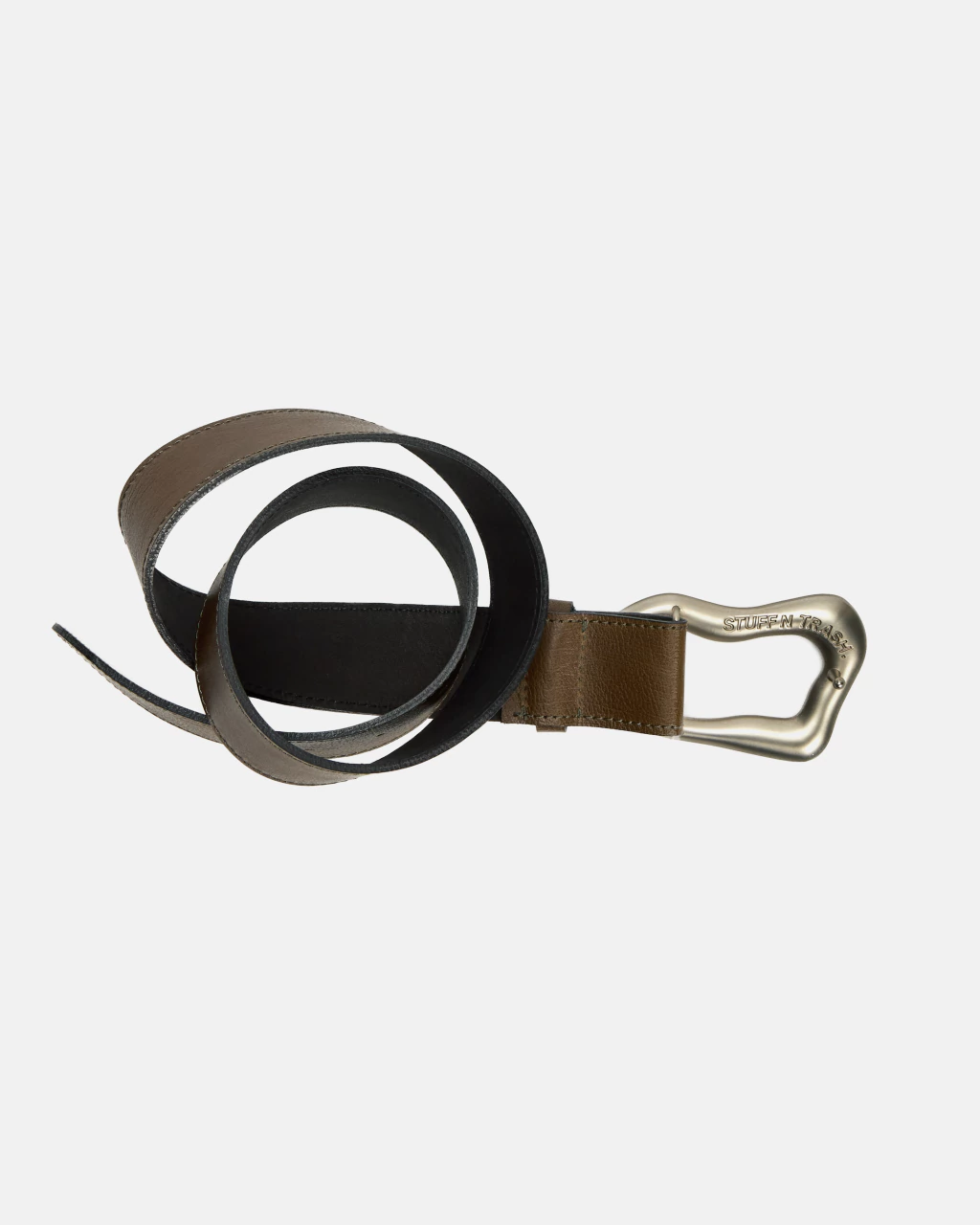 Cintrón de cuero vacuno color verde oliva. La hebilla es metálica en color plateado mate.