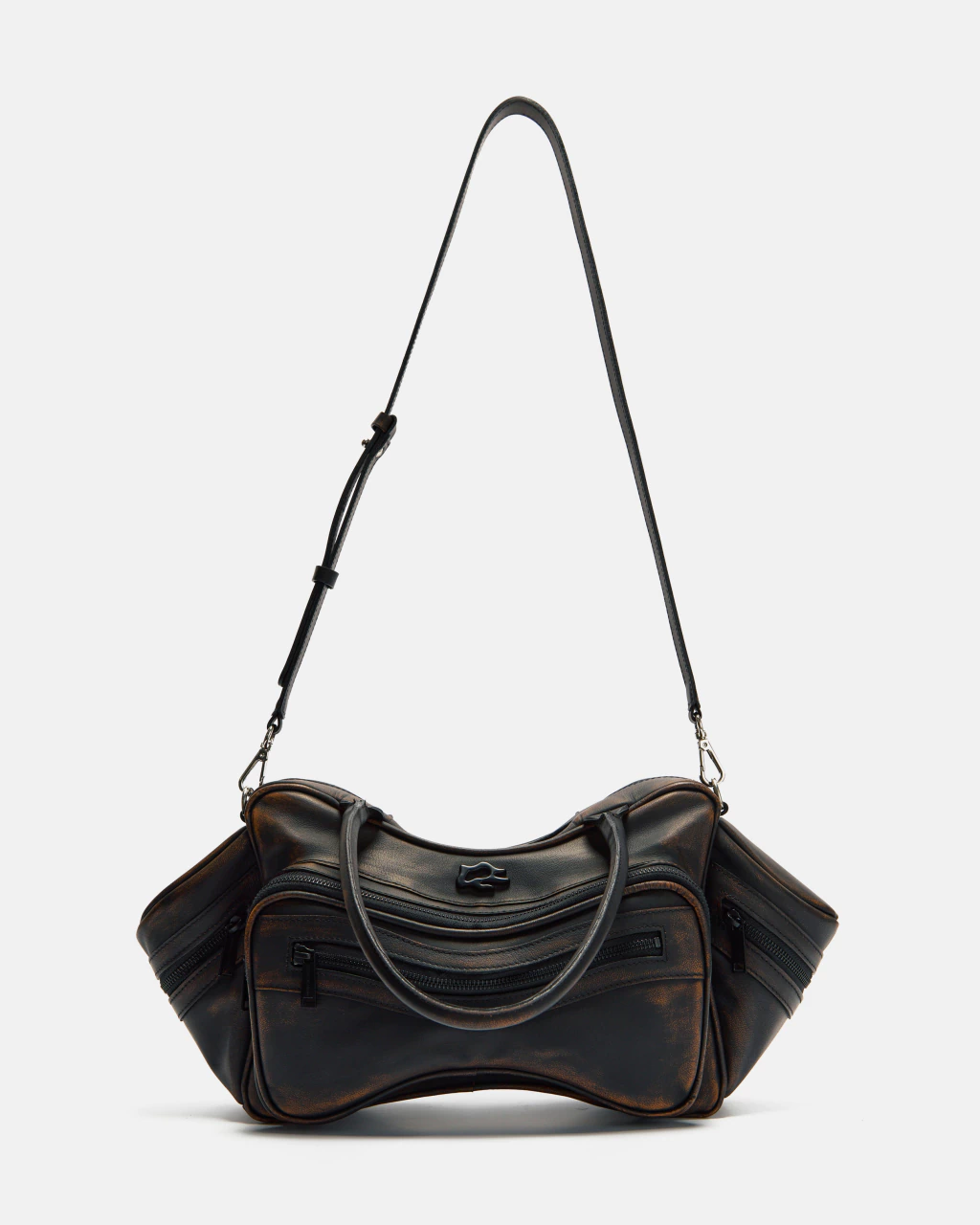 Tool Bag en cuero vacuno negro con desgaste color marrón. Presenta múltiples bolsillos con cierre metálico en el delantero y en laterales. Con manijas para llevar al hombro y correa regulable y extraíble mediante mosquetones metálicos para usar de bandolera. El interior esta forrado en 100% algodón negro y cuenta con un bolsillo con cierre.